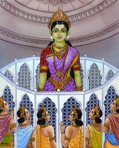Once a famous merchant received a Divine gift of earrings which were gifted to the child. As she grew up her beauty and piety is said to have captivated everyone. Many of the nearby Kings heard stories of her beauty and were keen to see her.