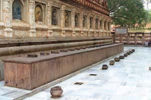 The Buddha spent the third week in meditation in this place practicing the walking meditation or Cankamana or ‘Cloister walk’. The spot where the Buddha placed his feet while walking is marked by a raised platform with lotus flowers.