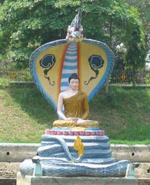 In this place the Buddha spent his sixth week of meditation. It is said that during this time a severe storm broke out and seeing the Buddha getting drenched the King of Snakes in the lake named Muchalinda came out of his abode to protect the Buddha with his hood against the wind and heavy rains.
