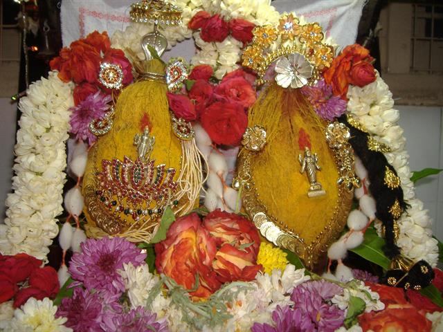 The festival is celebrated on the 14th day of Bhadrapada Shukla Chaturdashi (14th day of waxing moon in the month of Bhadrapada Masa, Sep- Oct). The festival is known as Anantha Chaturdashi, as the festival is celebrated on the 14th day of the month. The vratha is performed by placing two Kalashas along with the Anantha Daara (thread). One Kalasha (Kalasha refers to placing of a coconut smeared with turmeric and tilak on a copper pot filled with river water and raisins. The copper pot is decorated with fourteen betel leaves and on the betel leaves is placed the coconut) is decorated with yagnopaveetham and dharbhe/sacred grass indicating Lord Anantha Padmanabha. The sacred grass (seven in number) is tied together to form a hood, representing Anantha and the other Kalasha is decorated with jewellery indicating Goddess Lakshmi. Both the kalashas are decorated with garlands. Then Lord Anantha Padmanabha and Goddess Lakshmi are invoked by performing the Shodashopachara Puja. The Puja is performed using 14 varieties of flowers and leaves. Special sweets are prepared and offered to the Lord. Athirasa, a sweet made of rice floor, jaggery and coconut is prepared and offered to the Lord. Puran Poli is also made and offered to the Lord as Neivedhya. All the sweets are offered in 14 numbers, like 14 puran poli, 14 Athirasa etc. Couples are invited for lunch. People who perform this vratha are blessed with Ayush (long life), Arogya (health) and Gyana (knowledge). The Anantha Vratha is observed for 14 years and during the 15th year, Udayapane (a ritual performed for ending a vratha formally) is performed.